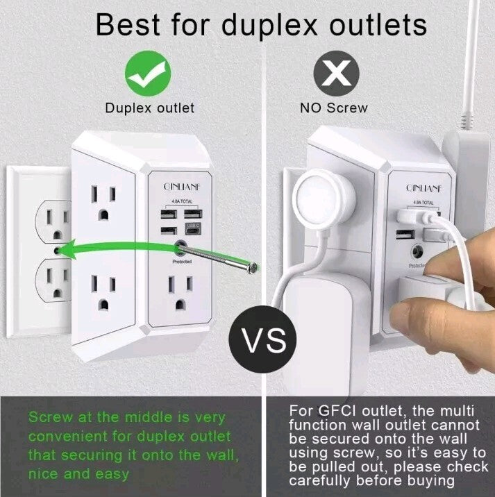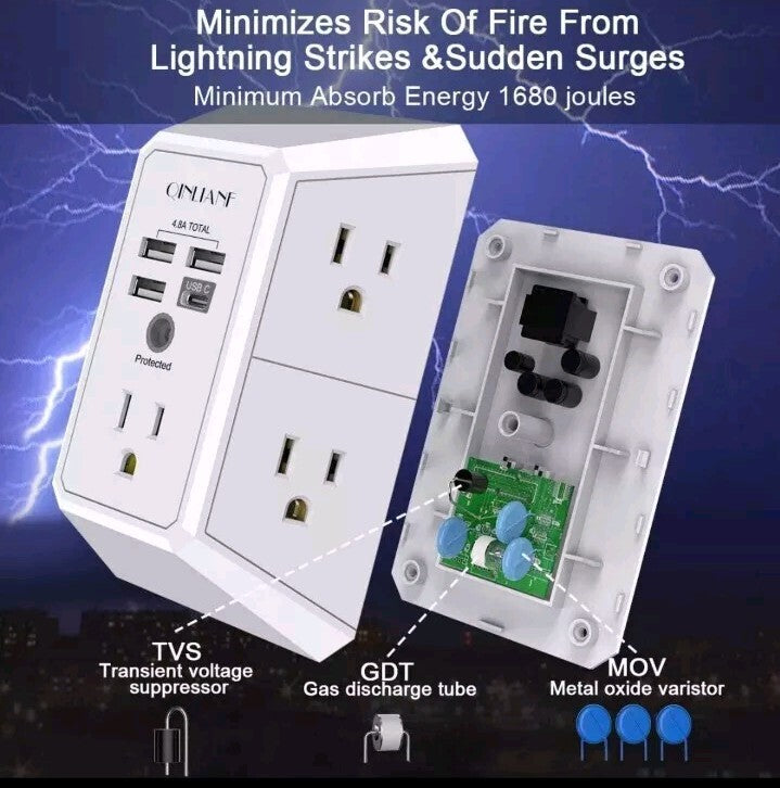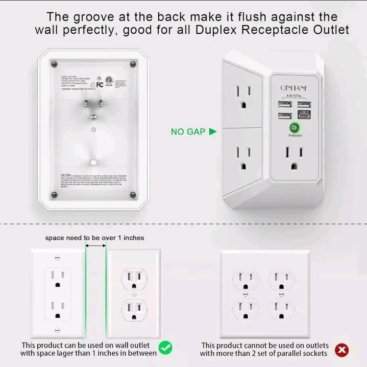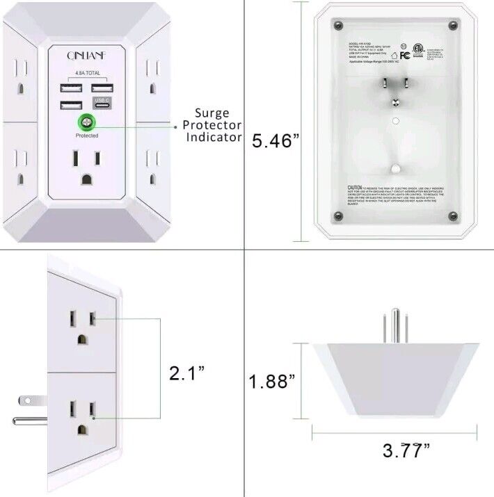 5 Outlet Extender with 4 USB Charging Ports (4.8A Total) 3-Sided Multi Plug Adap