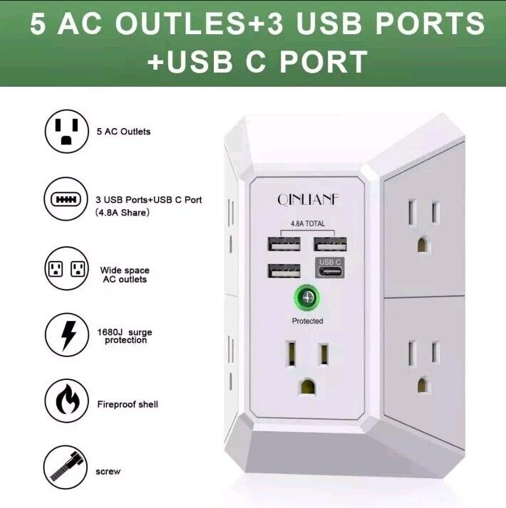 5 Outlet Extender with 4 USB Charging Ports (4.8A Total) 3-Sided Multi Plug Adap. Condition is New. Shipped with USPS Ground Advantage.