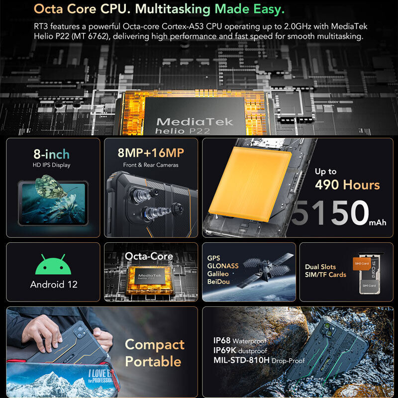8" Oukitel RT3 4G LTE Rugged Tablet PC Phone Android Mobile Waterproof Unlocked