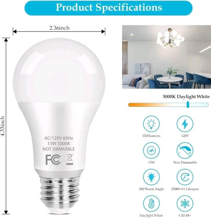 A19 LED Light Bulb, 100 Watt Equivalent LED Bulbs, 13W Daylight White 5000K