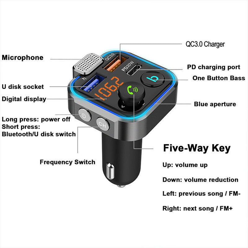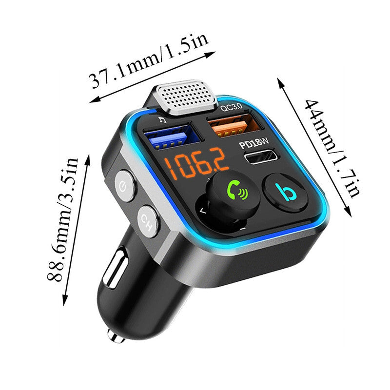 Features: 【PD 20W and QC 18W Fast Charging】Dual USB and one type C port for fast charging enables you to charge 3 devices at the same time as well as offer a better charging performance. Equipped with a USB-C power delivery port and 20W output power, you could charger your lastest iphone, ipad, cellphones, tablets at full speed. 【Noise-cancelling - Bluetooth V5.0 With Wide Compatibility】 The Bluetooth V5.0 chip establishes an ultra-secure connection between your phone and the bluetooth adapter car FM transmitter. Faster pair and more stable sound than bluetooth v4.2 make it avoid some unstable connection. Widely compatible between any devices which support bluetooth and cars in 12-24V. 【Lossless Hi-Fi Sound- Deep Bass Booster】With anti-interference performance and CVC technology, you can enjoy the fantastic deep bass music by pressing the B button. Plus, the light will dance with such stronger and powerful music. Gradient lights would truly bring you party atmosphere. 【Better Hands-Free Calling And Voice Navigation】Bluetooth provides a stable connection, while CVC noise cancellation and echo cancellation technology provide an incredible hands-free calling experience. 【Activate Siri and Google Assistant】Bluetooth FM transmitter V5.0 can achieve crystal clear voice commands to ensure safe driving. You can stay fully focused on the road by engaging Siri or Google Assistant in making phone calls, sending messages or getting driving directions. This option allows you to enjoy a more safer driving.  Specification: Bluetooth Version: V5.0 Frequency Range: 88.1-107.9MHz Product Input: 12-24V Wireless effective distance: 10m FM transmission distance: 3m Music Format: MP3, WMA, WAV, FLAC USB flash drive Capacity ≤ 64GB Size: 46*46.7*79.7mm