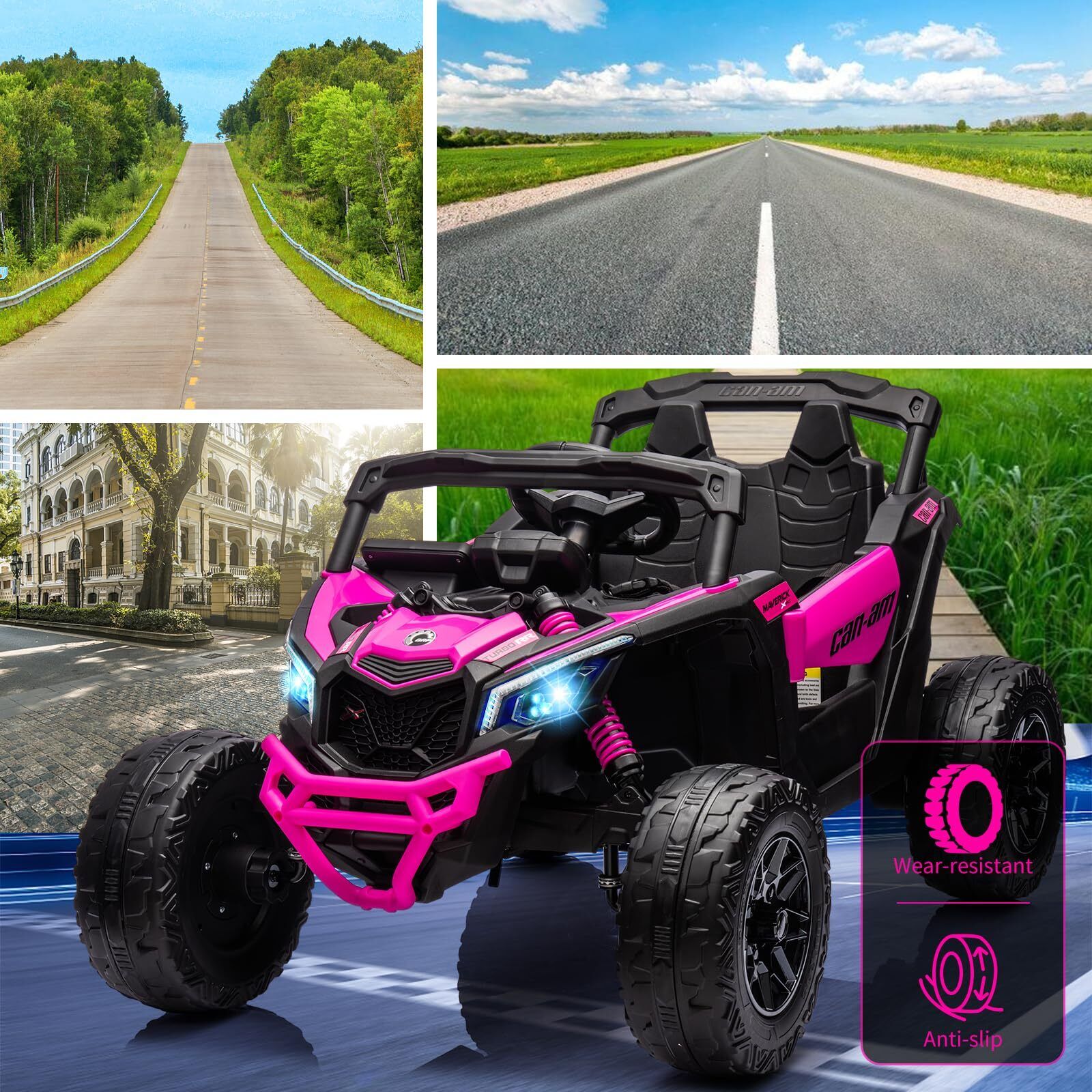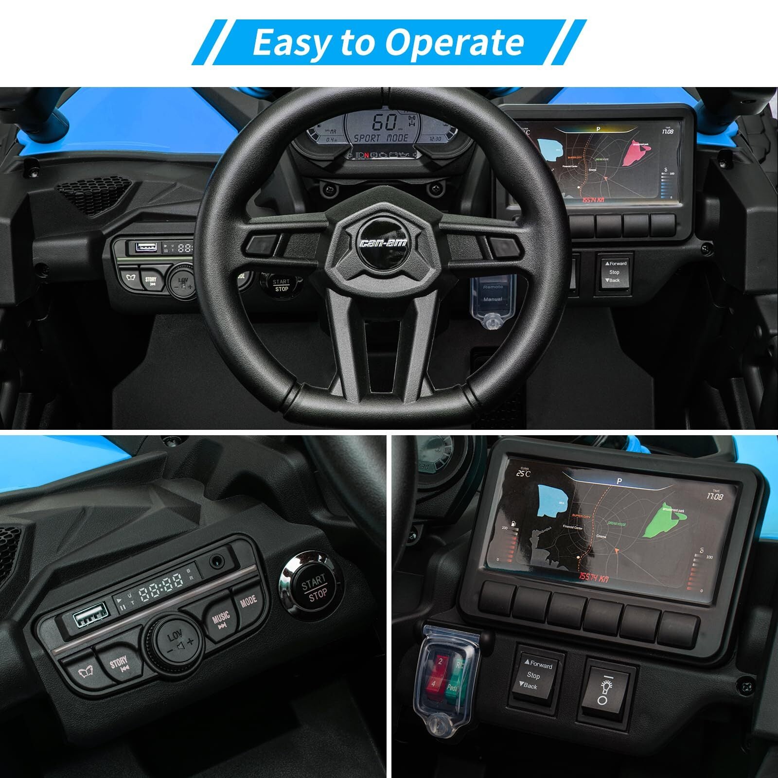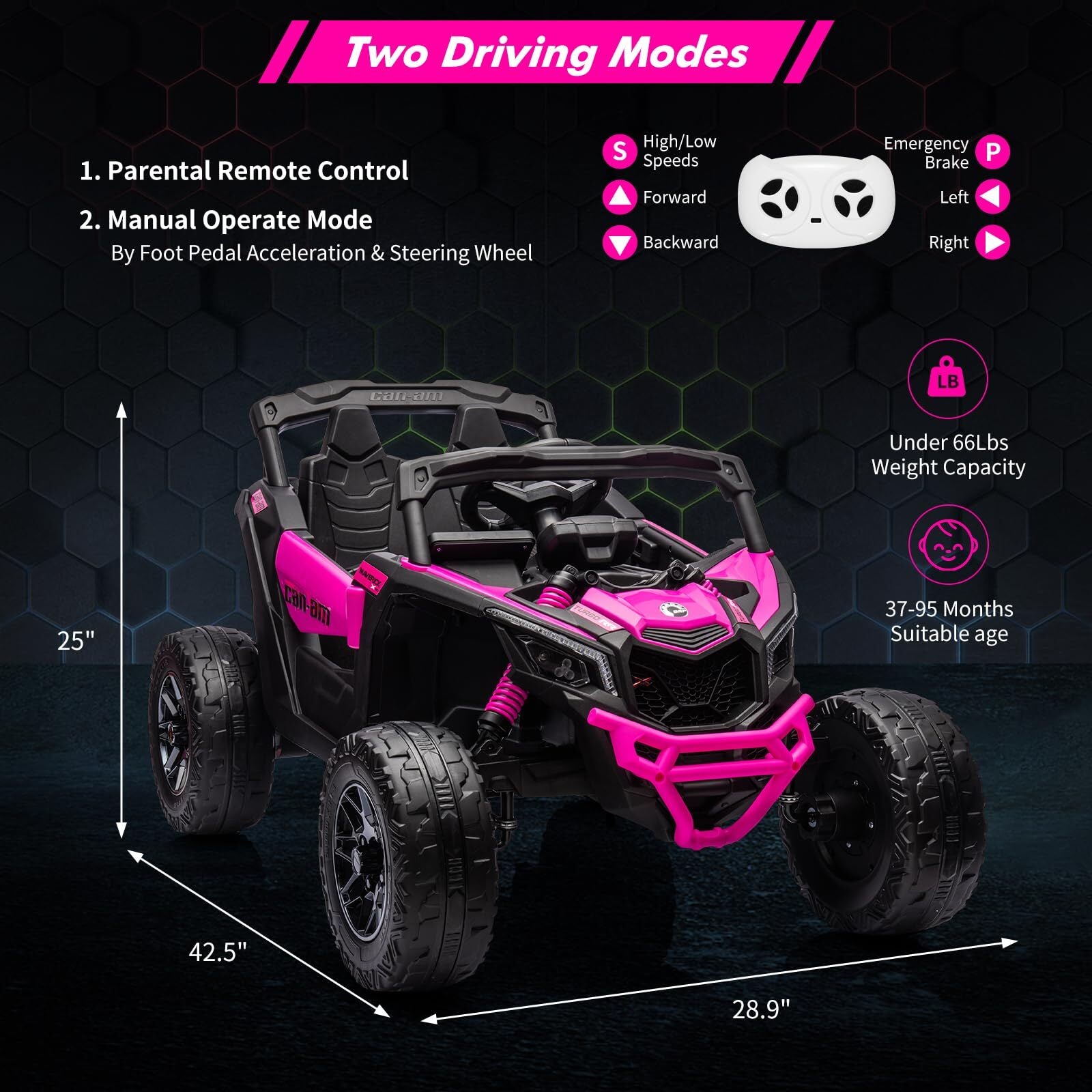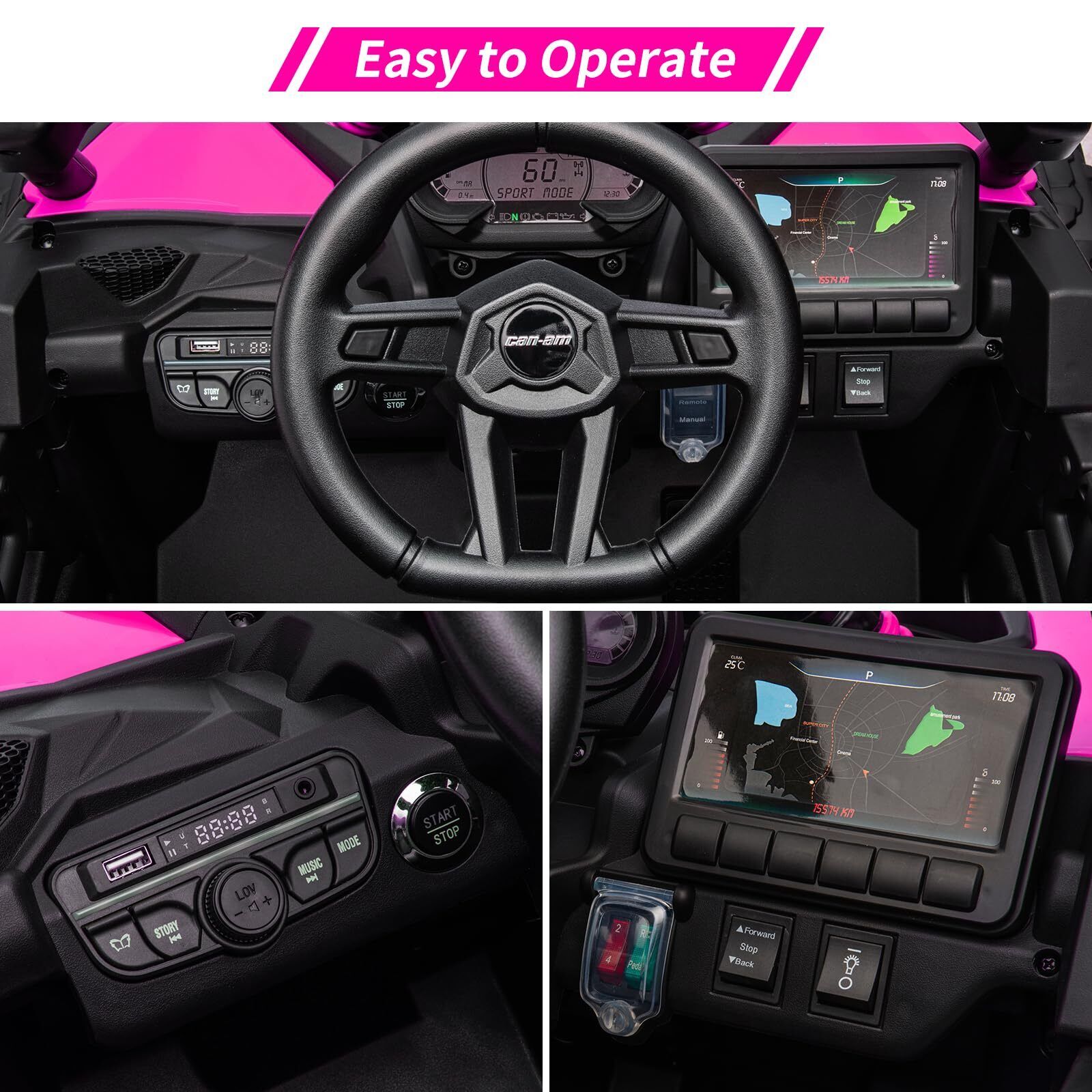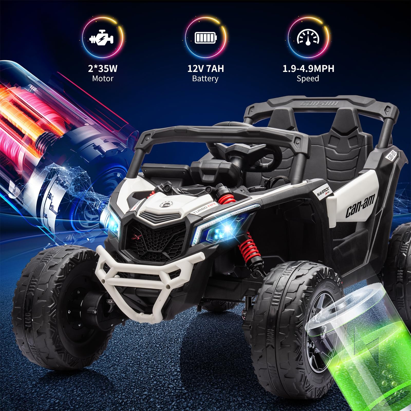 - 🚗【12V Licensed Can-Am Ride on UTV Car】Ride-on UTV car is officially licensed by Can-Am and comes with a remote control.Children can drive the car themselves using the foot pedal for acceleration and the steering wheel for maneuvering. Alternatively, parents can take control using the 2.4G remote control, which provides forward, reverse, and park controls, steering operations, and 3-speed selection.