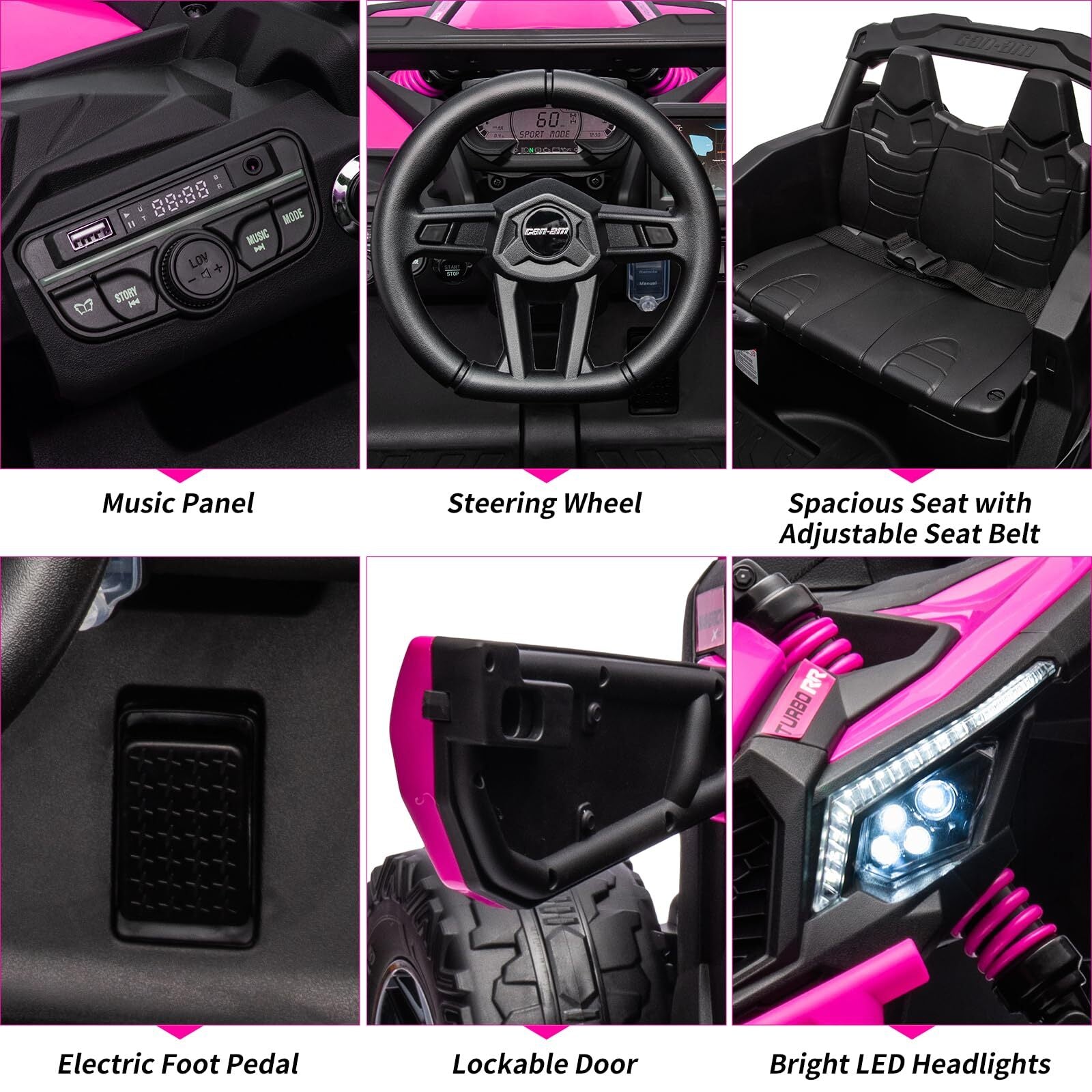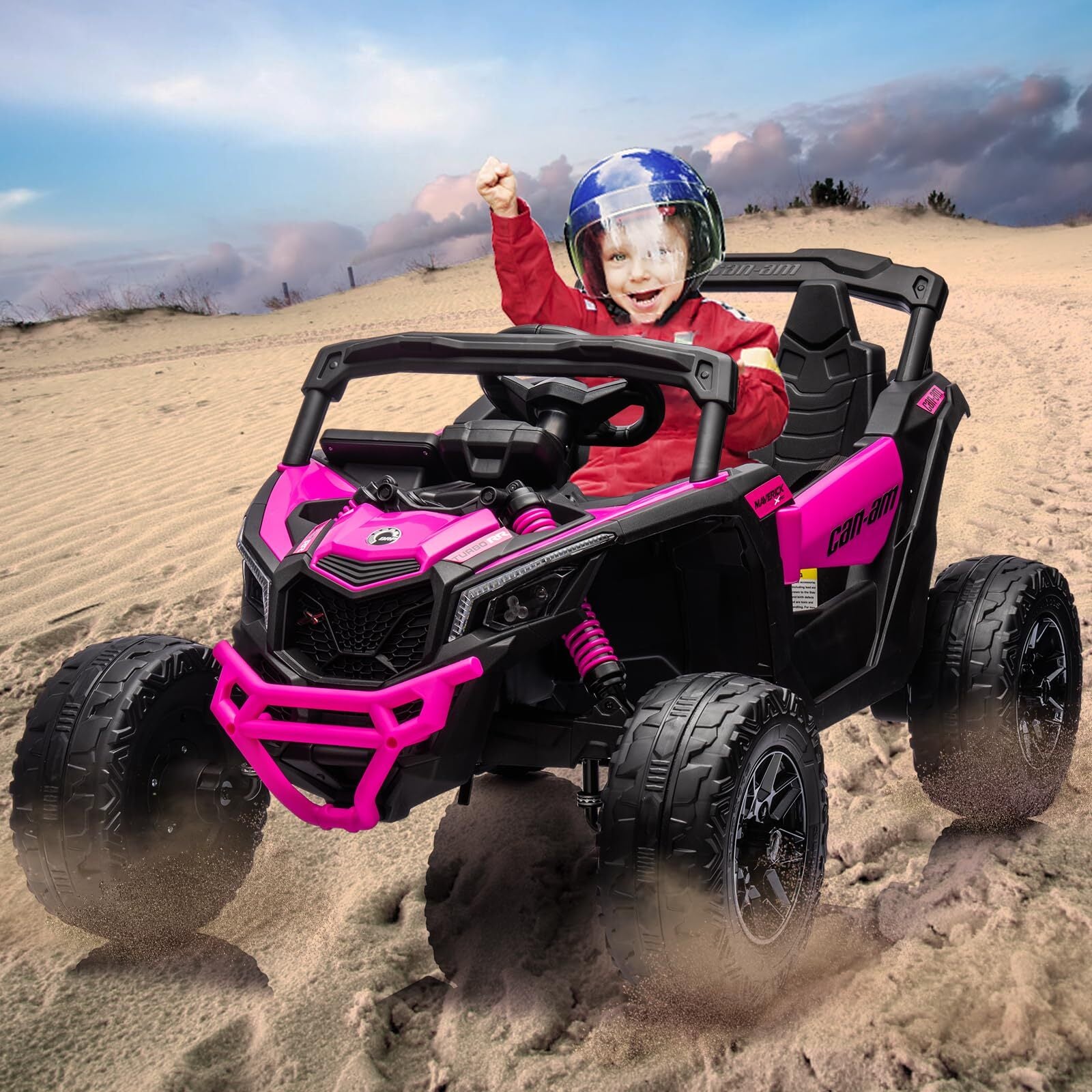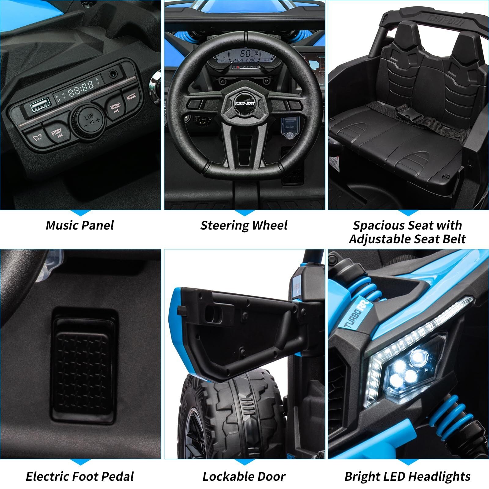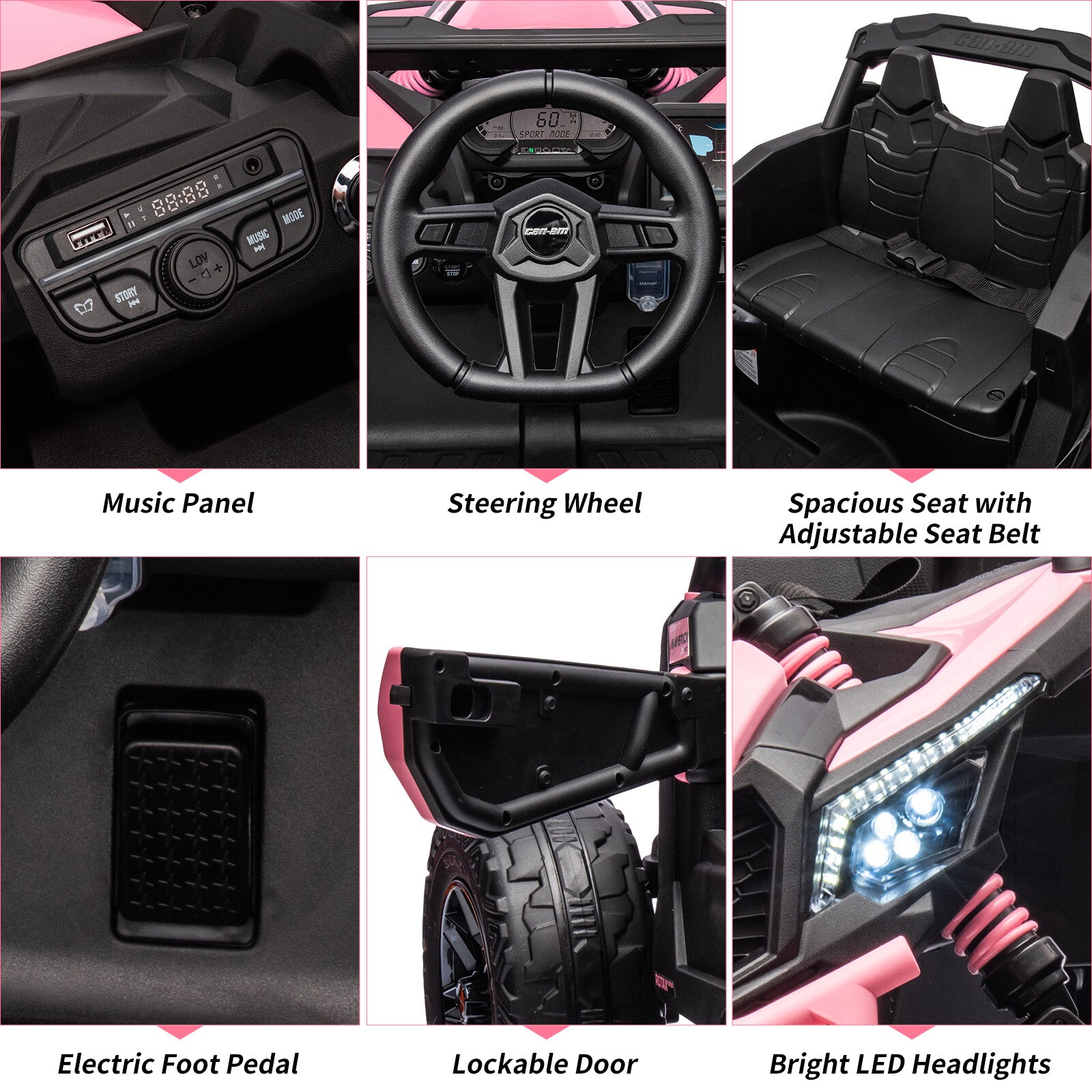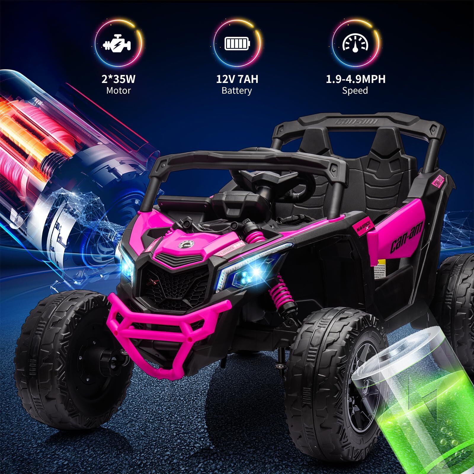 - 🚗【12V Licensed Can-Am Ride on UTV Car】Ride-on UTV car is officially licensed by Can-Am and comes with a remote control.Children can drive the car themselves using the foot pedal for acceleration and the steering wheel for maneuvering. Alternatively, parents can take control using the 2.4G remote control, which provides forward, reverse, and park controls, steering operations, and 3-speed selection.