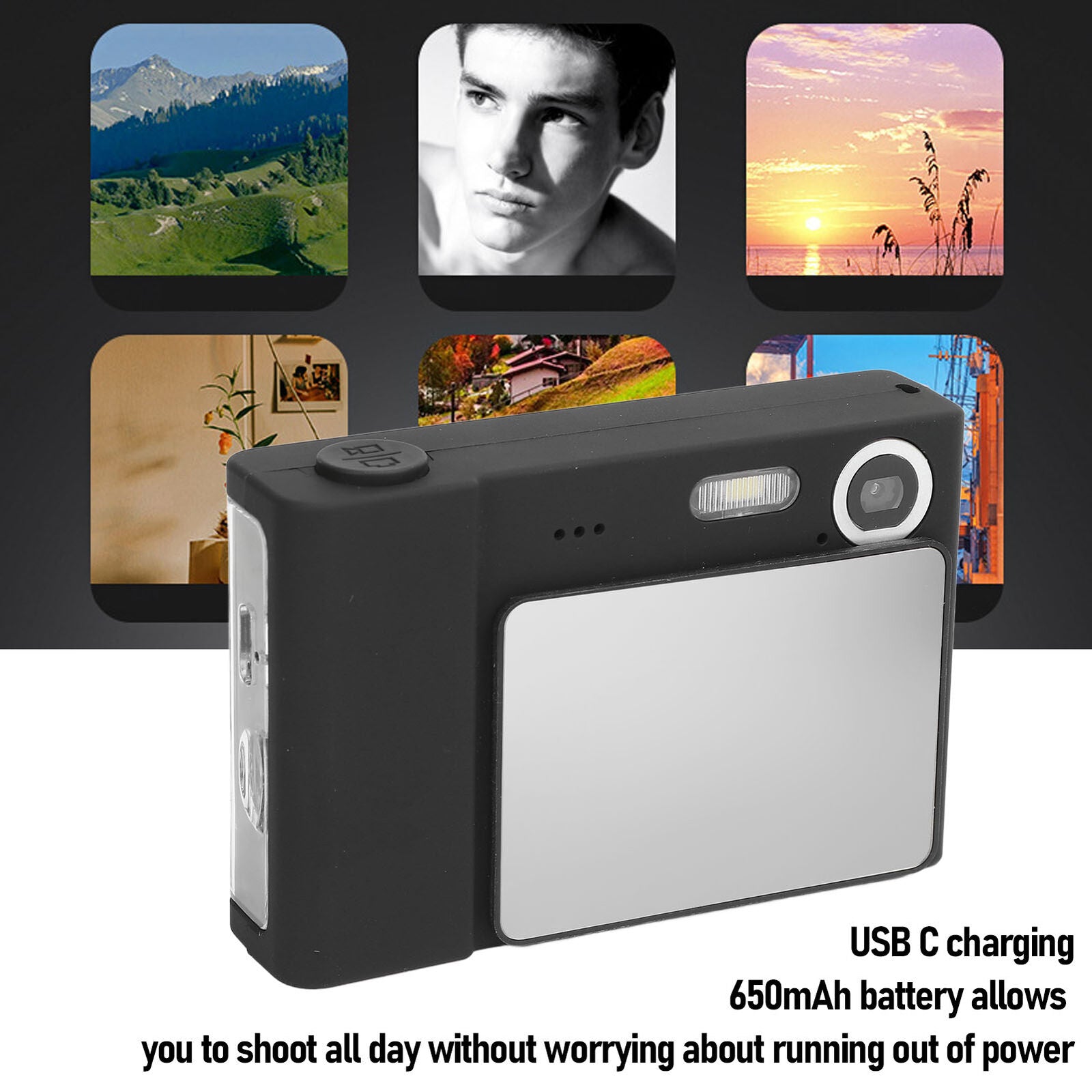 Feature: 1. 48MP 1080P HD: Featuring a high resolution CMOS sensor and a 2.4 inch color screen, this digital camera captures vivid 48MP photos and 1080P videos. The built in microphone ensures clear voice recordings, ideal for video making and webcam use.2. Zoom And Lighting Features: With 8x digital zoom, you can catch every detail in your frame. The fill light ensures adequately lit, clear shots. Discover fun features like anti shake and selfie modes, enhancing your photography experience. 3. USB C Charging: Recharge easily with the included USB C cable, ensuring power on the go. The 650mAh battery supports a full day of shooting, while the sized, lightweight design provides effortless portability for daily or travel adventures. 4. Easy To Use For Beginners: Designed for teens and beginners, this digital camera requires no complex setup, making it ideal for sparking an interest in photography and creating joyful memories with family and friends. 5. Ideal Gift: This compact camera makes a wonderful gift choice for special moments. Whether it's a child's first camera or a thoughtful surprise for a friend, it's ideal for Xmas, birthdays, graduations, and more, making occasions memorable. Specification: Item Type: Digital Camera