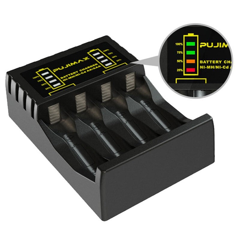 *4 slots for AAAAA Nickel-Cadmium NIMH rechargeable battery: This battery charger is designed with 4 slots, allowing you to charge AA and AAA Nickel-Cadmium NIMH rechargeable batteries simultaneously.