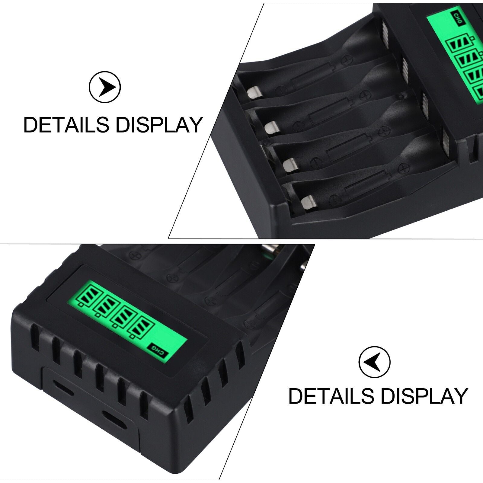 *LCD display: The for Smart battery charger features an LCD display, which shows the charging status of each battery slot in real-time. You can easily monitor the battery level and know when the charging process is complete.