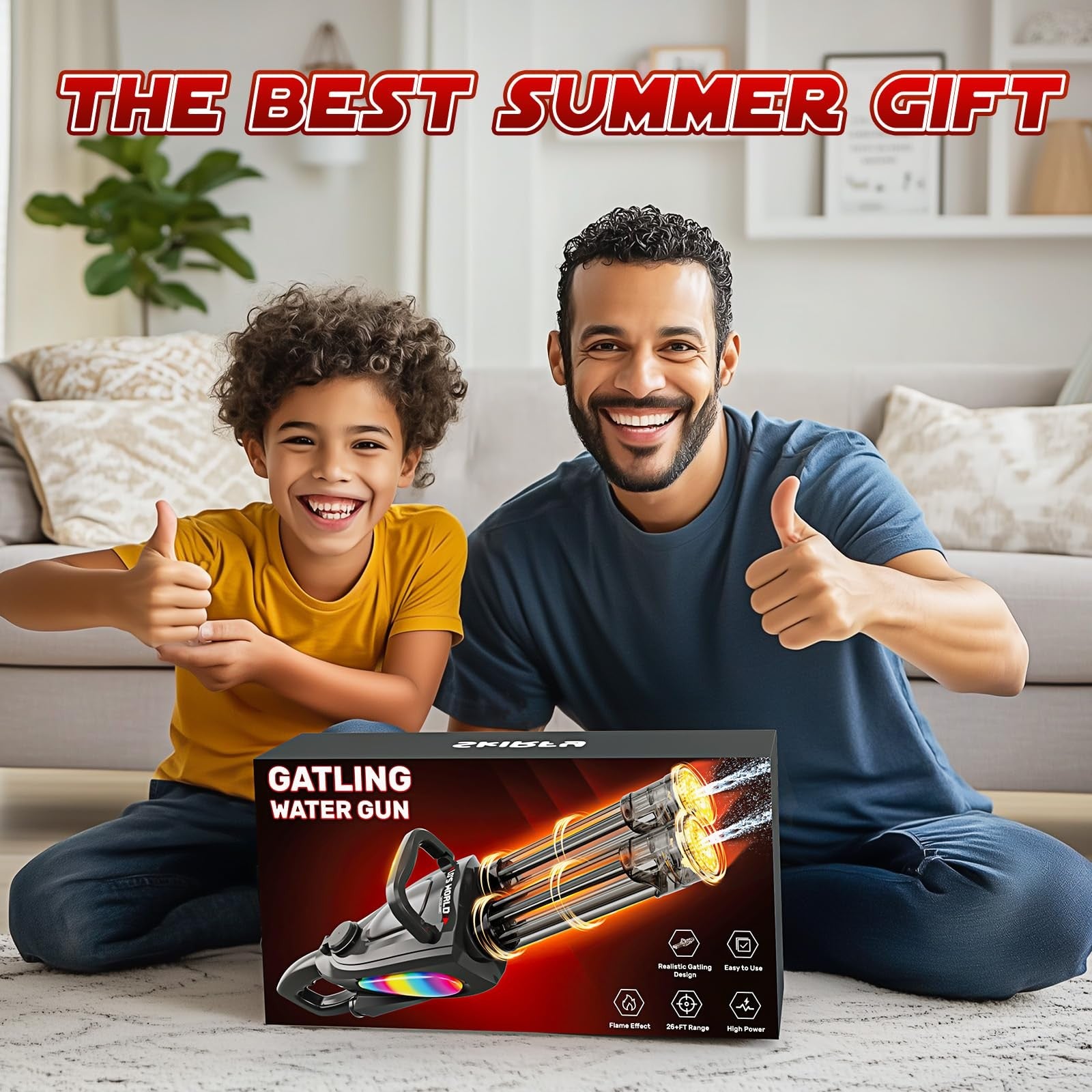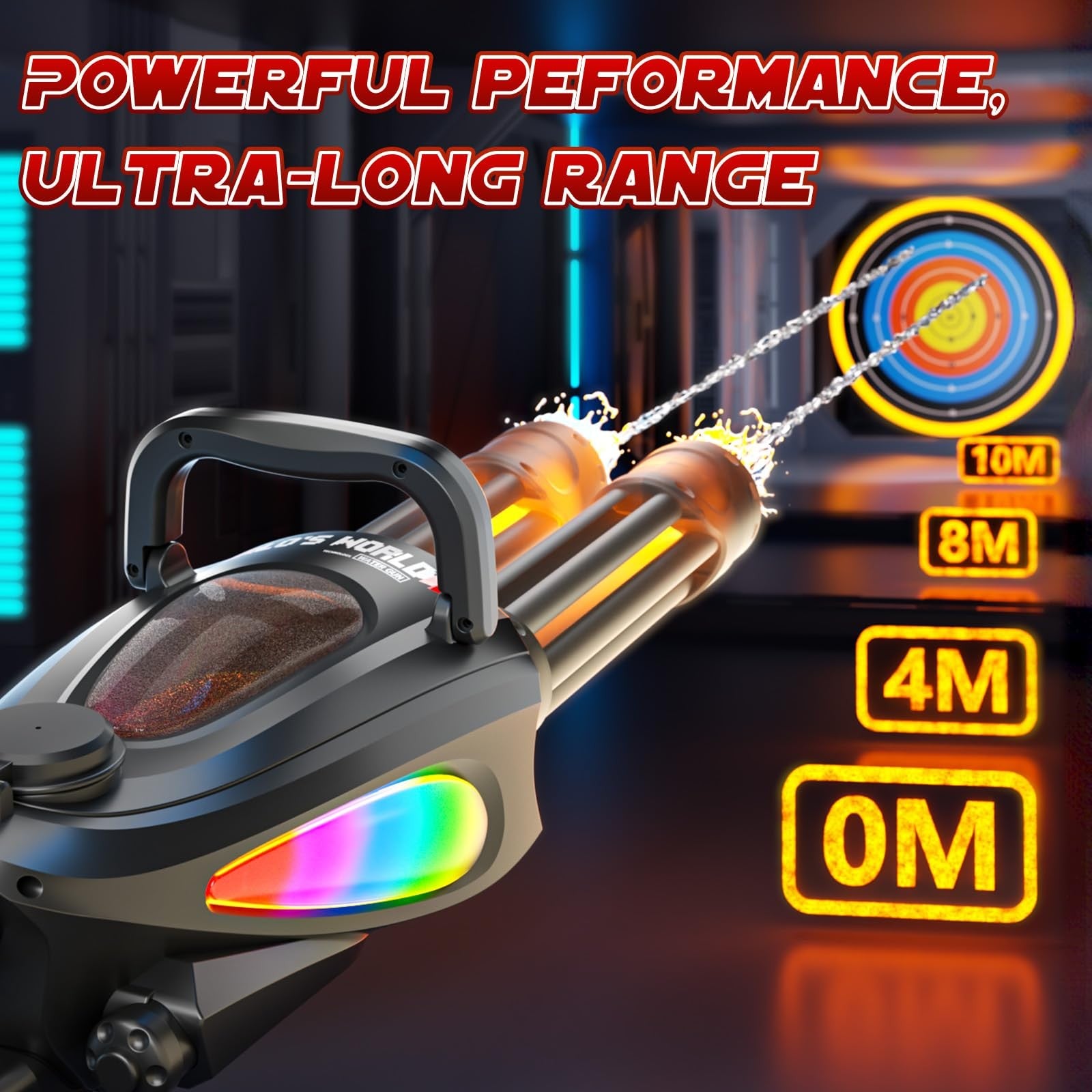 Gatling Electric Water Gun with Rotating Barrel, LED Muzzle Light, Dual Water Output, Modular Battery System, Compatible with External Water Bottle, High-Power Outdoor Toy for Kids Ages 8-12. LED Muzzle Light for a Dazzling Effect:Every shot releases a dazzling LED muzzle light that illuminates the path of the water droplets.