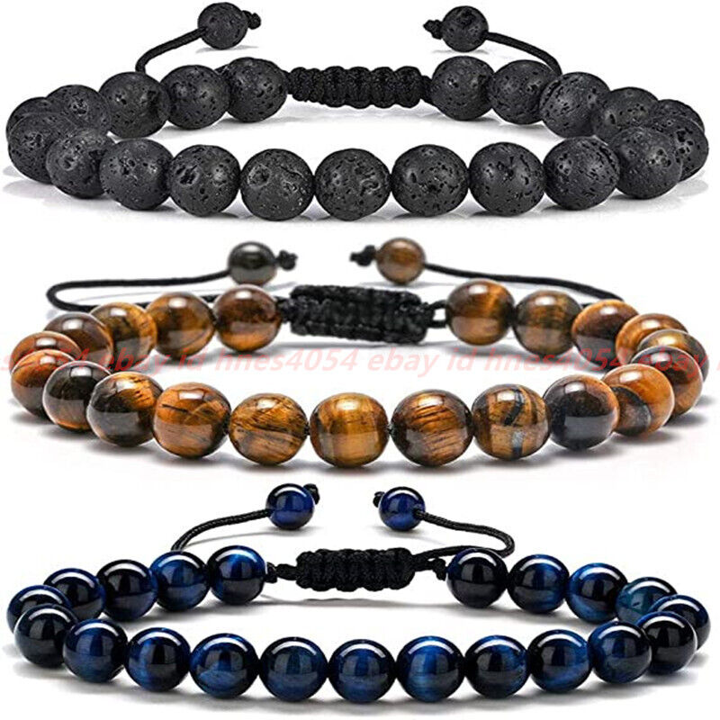 Handmade Natural 3 Pcs 8mm Tiger's Eye & Black Lava Gems Braid Bracelet 7.5in
