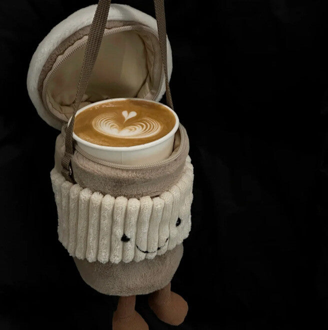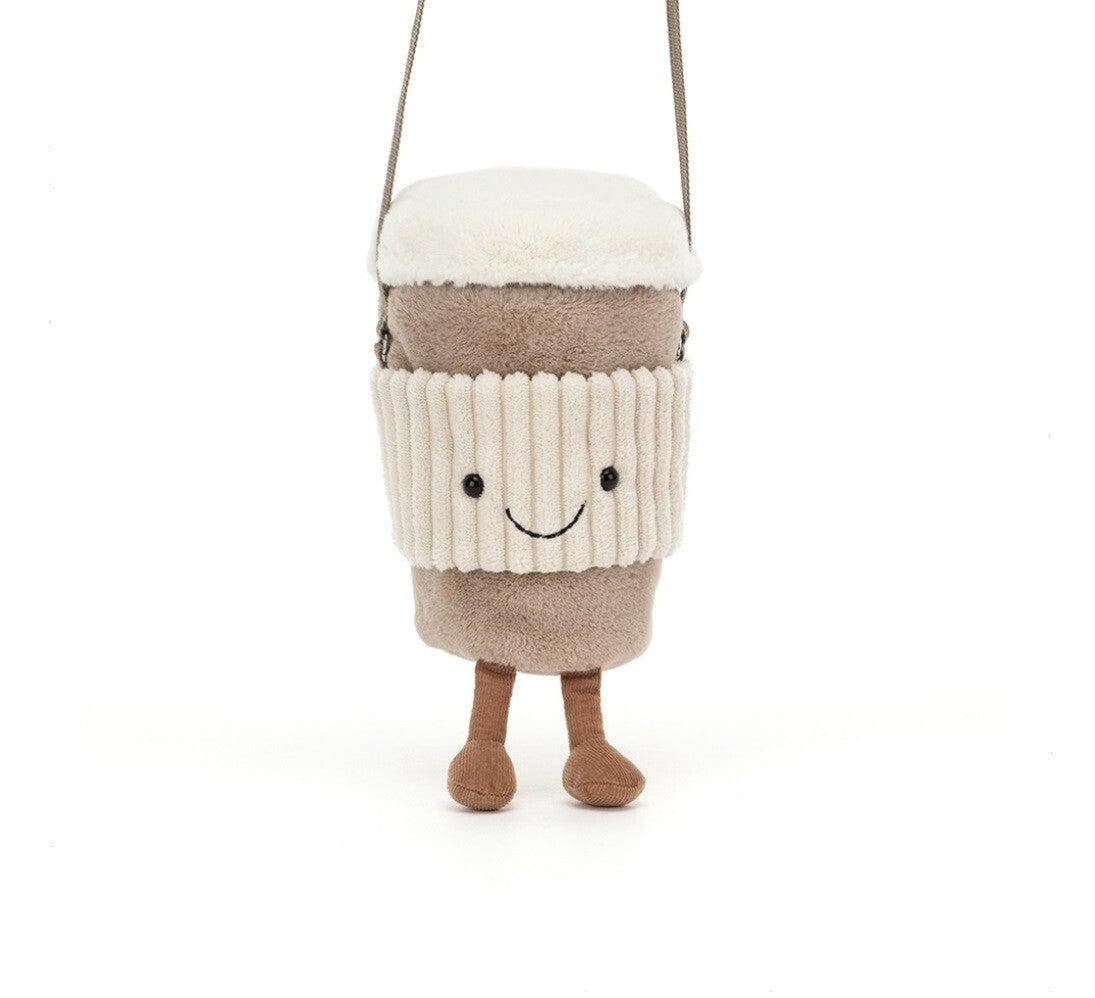Jellycat Amuseable Coffee-To-Go Bag. Grab a little shot of sunshine with the Amuseable Coffee-To-Go Bag! This supercute coffee has waggly legs, a chunky cord holder and a jolly smile. Strap length 113cm (44.5").