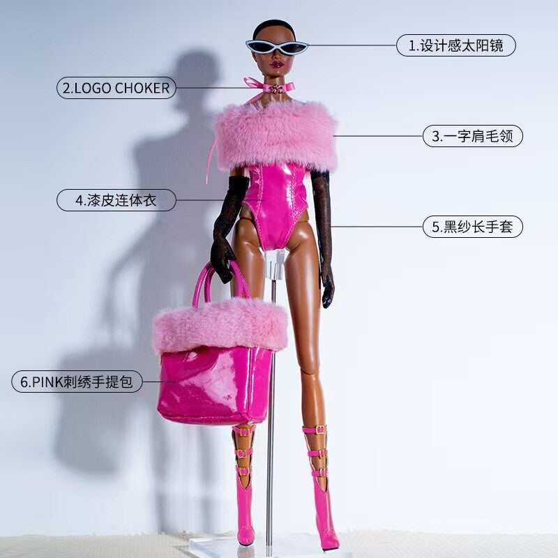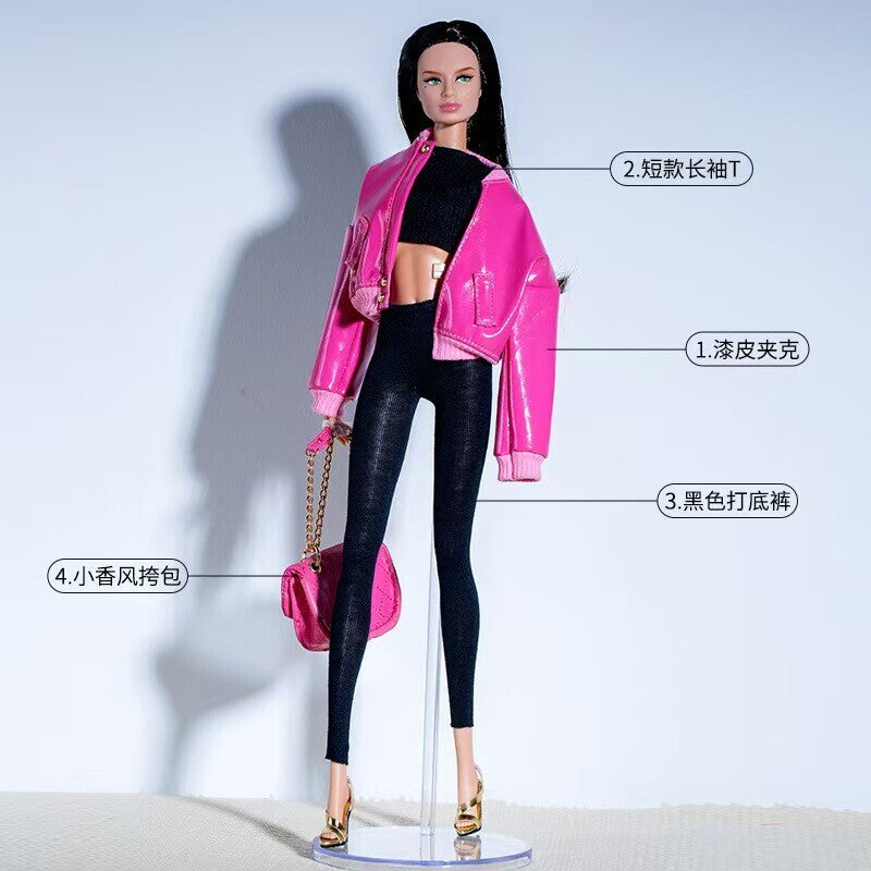 Leather Hot Pink 1/6 Doll Clothes Outfits Set Evening Dress Gown Coat Gloves 1:6