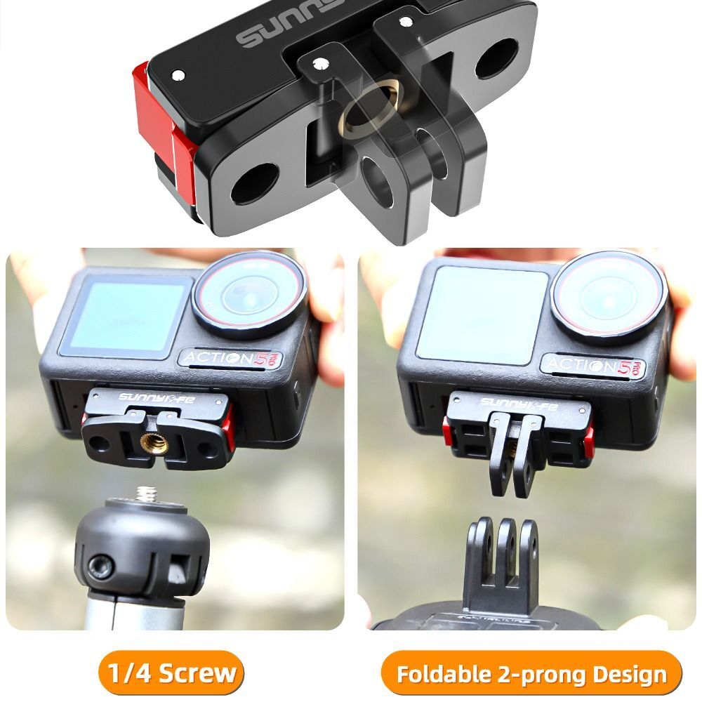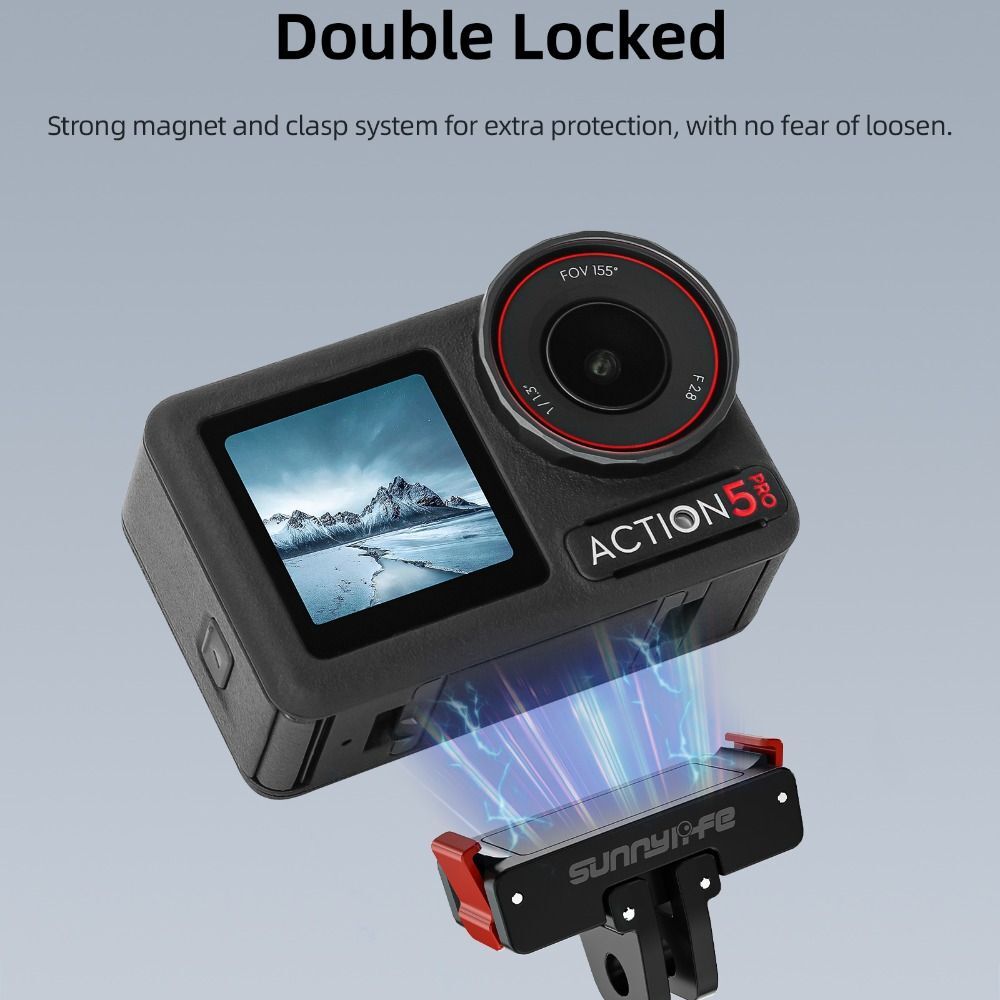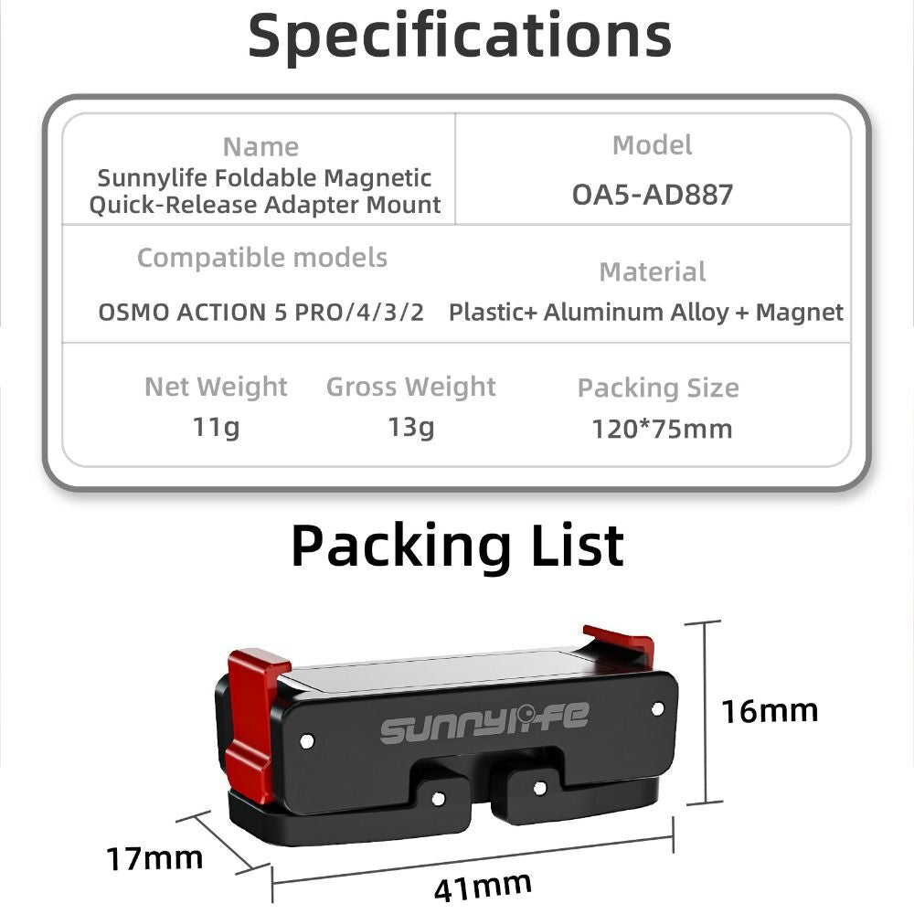 Applicable model: For DJI OSMO Action 5 Pro/4/3/2. Magnetic suction and claw buckle, double stability. 1 x Magnetic Mount Adapter. Material: plastic+aluminum alloy+magnet. 1/4 screw mouth and foldable two jaw jaws, with two variable interfaces, suitable for various expansion devices.
