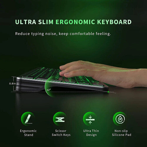 Ultra Slim Ergonomic Keyboard -- Ultra Slim design (the thinnest part is just 0.3 inch) and classic keyboard color greatly enhance texture and easy to carry. Unique scissor switch keys and ergonomic stand help reduce typing noise, keep comfortable feeling.