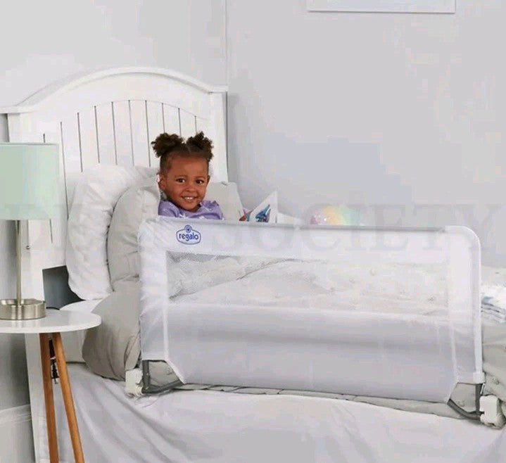 The Regalo Swing Down Bed Rail Guard is a sturdy and secure baby safety feature designed to prevent toddlers from rolling out of their bed. With a reinforced anchor safety system, this 43-inch long bed rail provides peace of mind for parents. The patented gap guard technology ensures a safe fit, and the portable design makes it easy to use without requiring any tools. Made of steel, this white bed rail is specifically designed for toddlers and offers a secure and reliable solution for keeping them safe while they sleep.