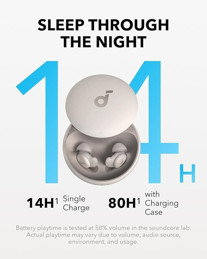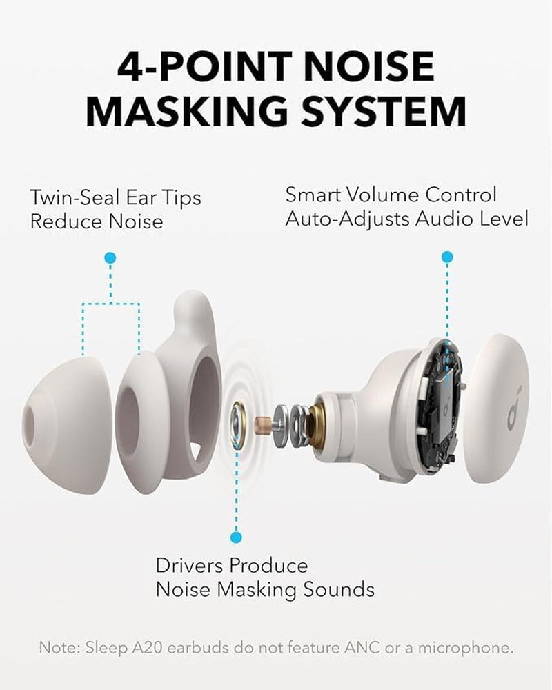 Note: Sleep A20 earbuds earplugs do not feature Active Noise Cancelling. - Ideal for Side Sleepers: Sleep A20 bluetooth earbuds earplugs utilizes the combined efforts of soundcore’s Air Wing and 3D ergonomic design—wrapped in an ultra-soft material—for the added benefit of pressureless comfort, even when sleeping on your side.
