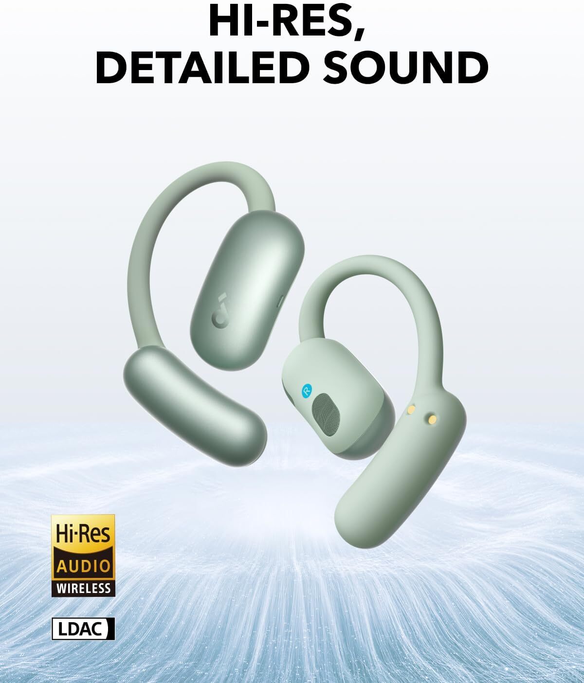 Soundcore AeroFit 2 by Anker, Open-Ear Headphones, Adjustable Ear Hooks, Snug Fit, Rich Bass, Hi-Res Wireless Audio, 42H Play, Bluetooth 5.4, Wireless Charging, IP55, AI Clear Calls. Indulge in full-bodied Hi-Res wireless audio, refined by LDAC.