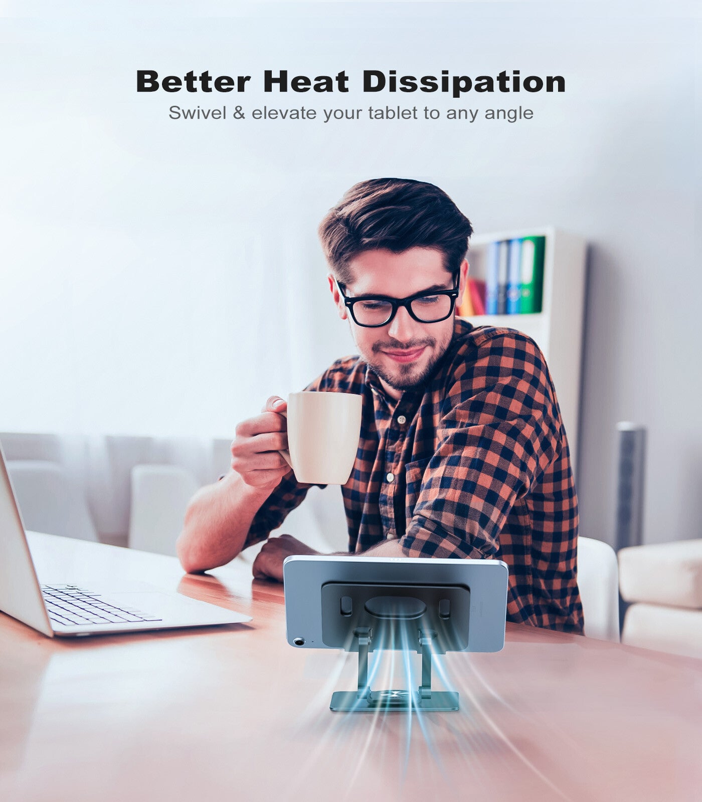 About the item: Adjustable & Comfortable. This tablet stand is easy to elevate and tilt your tablet to a perfect viewing angle, ensuring you are comfortable while watching movies, reading e-books, using Facetime, zoom meetings, doing homework, viewing recipes, and enjoying games. Rotatable & Convenient. With a 360° rotation base, you can freely adjust the angle of the tablet stand holder to set the best viewing angle that suits your preference, also making it extremely easy to share content. Universal Use. This adjustable tablet stand fits any tablet, e-reader, or smartphone up to 12.9’’ even with a case on, compatible with iPad Pro, iPad mini, iPad Air, iPad, iPhone 14 Pro, Samsung S22, Galaxy Tab S8, Lenovo, Fire tablet, and more. Sturdy &Anti-slip Design . Premium aluminum alloy mat.